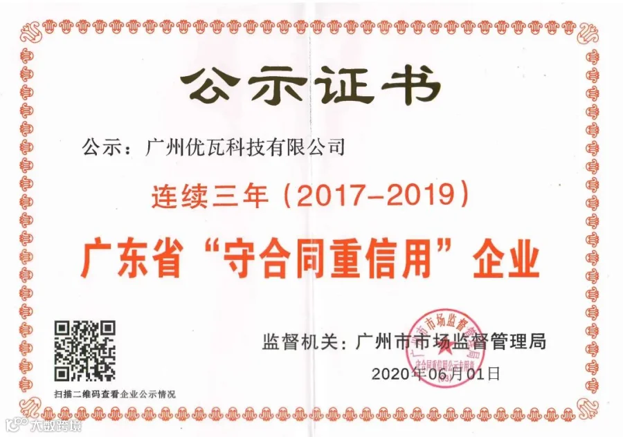 优瓦科技连续三年获得“广东省守合同重信用企业”,离不开广大消费者及合作伙伴的信任与支持。未来,我们将继续秉承“满足客户需求只是第一步,超越客户期望才是我们的追求”的理念,务实创新,诚信经营,在时间的历练中铸造金牌口碑,在市场的洗礼中成就卓越企业!