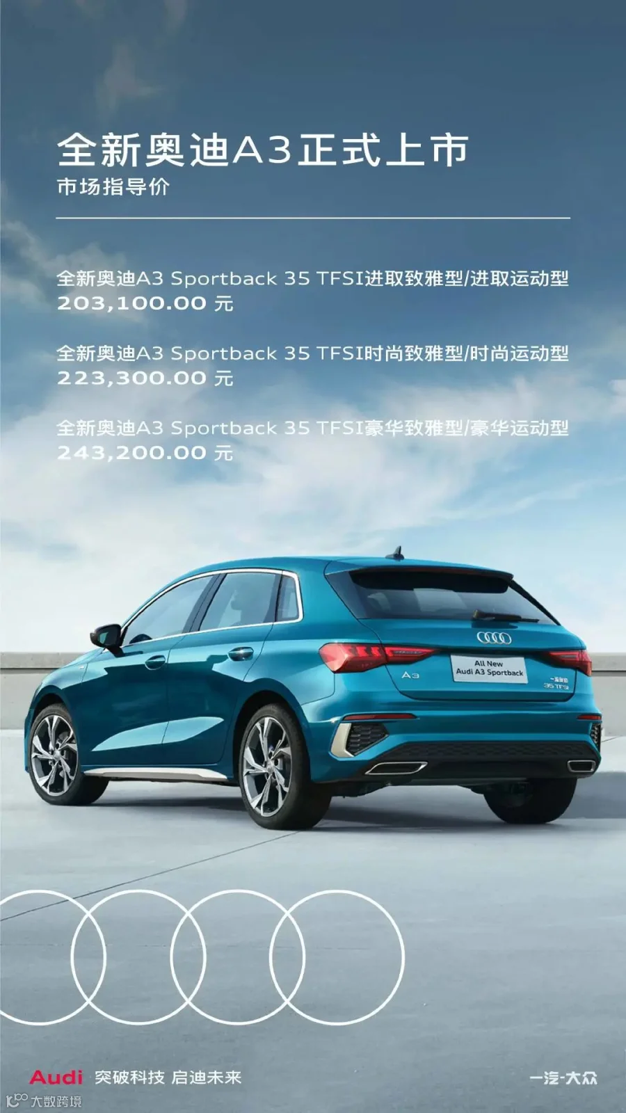 ——全新奥迪A3正式上市,市场指导价区间为20.31万-24.97万元。