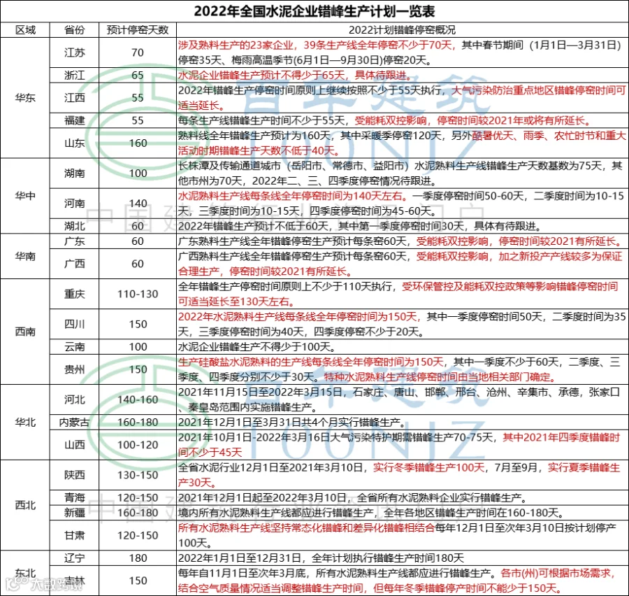 2022年,水泥行业在能耗管控以及”双碳“政策的持续影响下,各地区水泥企业错峰生产时间或将有所延长,部分地区错峰停窑规划已相继出台。其中,华东区域内,江苏发布2022年水泥行业错峰停窑不少于70天方案,停窑天数多集中在春节假期和梅雨高温季节。江西、福建地区或将因大气防污及能耗管控适当延长停窑天数。华南区域内,广东、广西地区受能耗双控影响,加之新增投产产线较多为保证合理生产,或将追加停窑天数。华北、西北、东北区域多地因大气防污及能耗管控严格执行错峰生产,积极推行水泥行业企业错峰生产常态化实施。