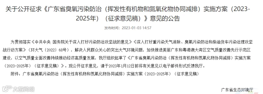 近日,《广东省臭氧污染防治(氮氧化物和挥发性有机物协同减排)实施方案(2023-2025年)》(征求意见稿)在省生态环境厅网站上进行公示,其中明确,到2025年,全省主要大气污染物排放总量完成国家下达目标要求,完成235项固定源NOx减排项目,12641项固定源VOCs减排项目,2006项移动源减排项目,即3年一共完成14882项减排项目,臭氧生成前体物NOx和VOCs持续下降。
