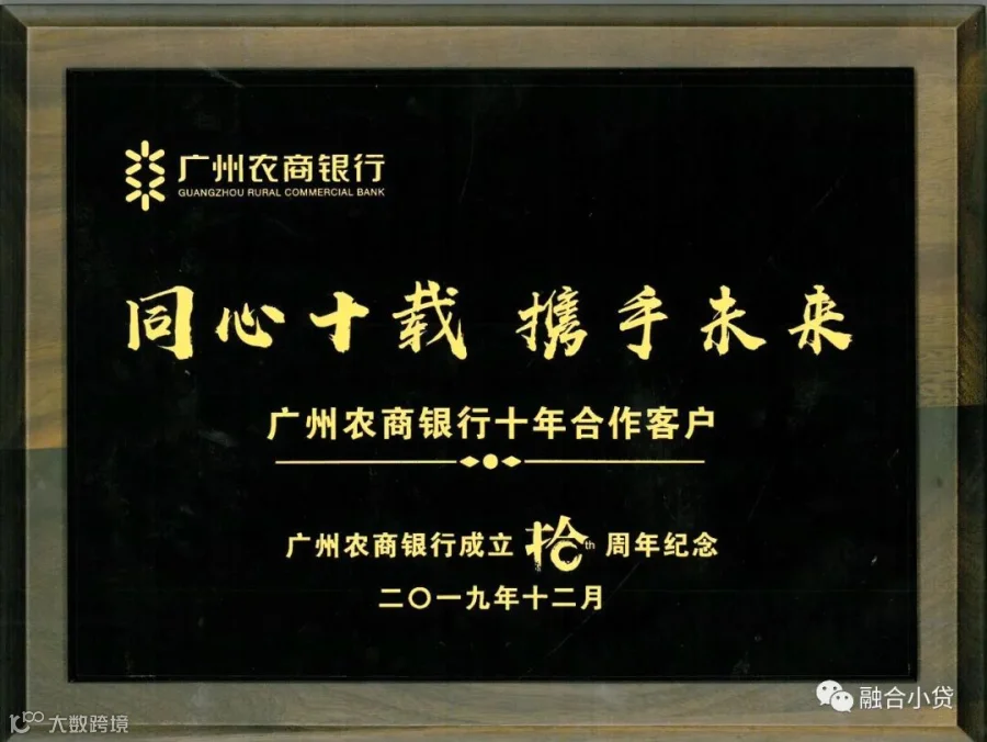 热烈祝贺广东自由鸟服装有限公司荣获广州农商银行颁发“同心十载、携手未来”优质客户纪念奖牌