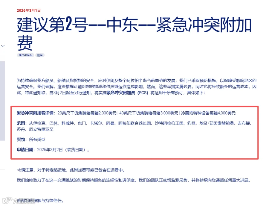 受当前中东地区局势影响,我司将自2026 年 3 月 2 日(装货日)起,对以下航线收取紧急冲突附加费: