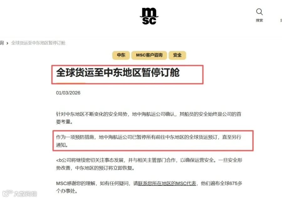 •MSC已暂停全球至中东区域的所有订舱,直至另行通知