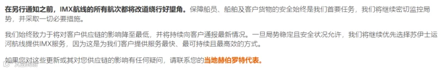 公司将持续密切跟踪事态发展,并与相关主管部门保持协同,确保运营安全。若后续需作出额外运营调整,或有关备选港口的信息更新,将第一时间告知客户。