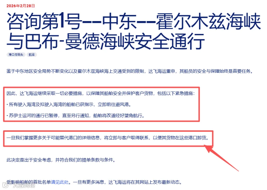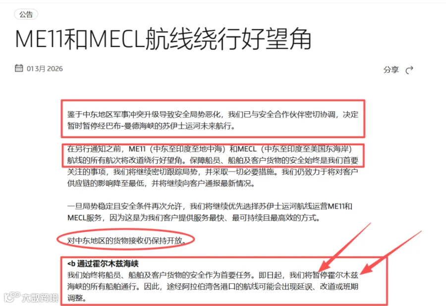 鉴于 2026 年 3 月 1 日中东地区安全局势急剧升级,霍尔木兹海峡、苏伊士运河通航风险显著上升,全球各大船公司已相继发布紧急运营通告。
