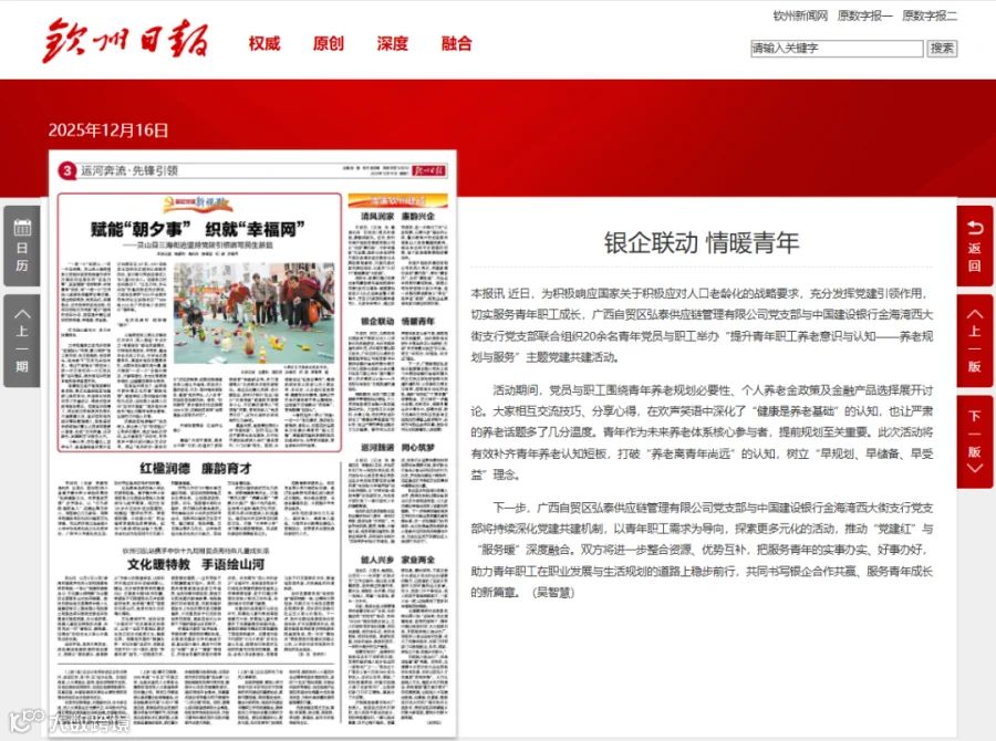 近日,为积极响应国家关于积极应对人口老龄化的战略要求,充分发挥党建引领作用,切实服务青年职工成长,广西自贸区弘泰供应链管理有限公司党支部与中国建设银行金海湾西大街支行党支部联合组织20余名青年党员与职工举办“提升青年职工养老意识与认知——养老规划与服务”主题党建共建活动。