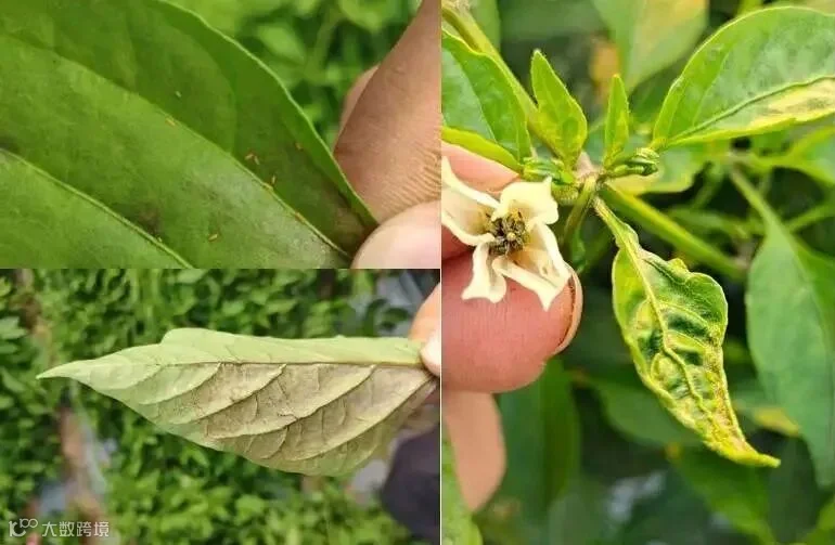 可危害花、叶、果实,受害的叶片出现斑点,表面变皱,发育变慢或畸形。