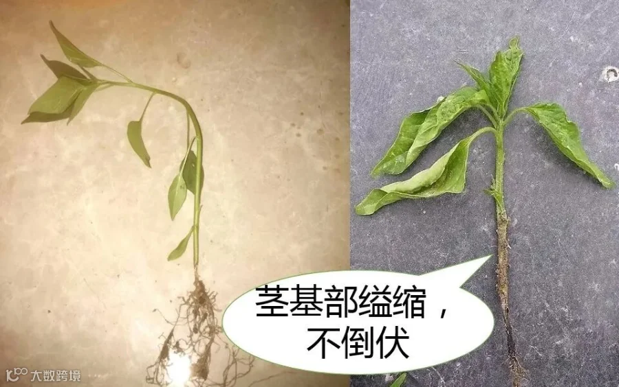 1.发病后在幼苗茎基部或中部会出现明显水渍状,逐渐缢缩成线状,幼苗倒伏;