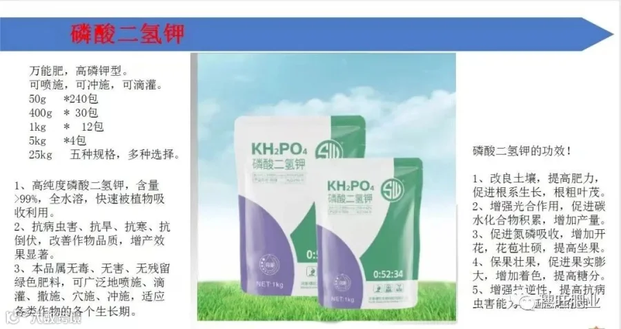 综上所述,磷酸二氢钾在作物的生长和开花结果过程中都有非常重要的作用,掌握和应用好磷酸二氢钾对提高品质和产量非常关键,而掌握到应用时期和搭配好其他成分又能起到事半功倍的效果。