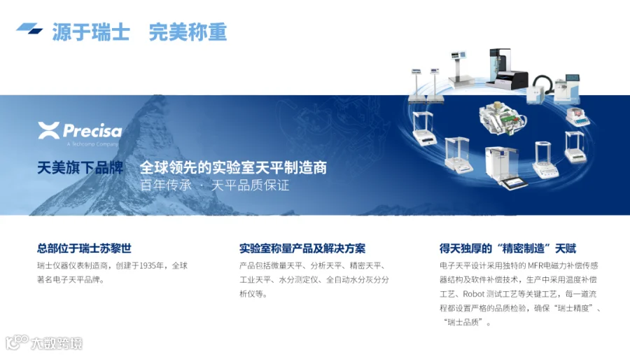 Precisa普利赛斯,瑞士仪器仪表制造商,创建于1935年,欧洲著名品牌,全球著名电子天平品牌。普利赛斯,凭借其核心称重技术及“品质至上”、“开拓创新”的理念,向全球仪器仪表客户及合作伙伴提供高精度称重产品及解决方案,包括半微量天平、分析天平、精密天平、工业天平、水分仪、灰分仪等。普利赛斯,通过与学术机构、实验室及工业领域的紧密合作,特别关注工程设计细节和客户反馈,不断改进电子天平设计以更好地满足客户需求。普利赛斯客户涵盖实验室及工业领域,已成功开拓欧洲、亚洲、非洲及美洲等全球市场。特别是在中国,依托上海天美及天美(中国)在全国各地的营销分支机构及销售渠道,给您提供及时、周到的服务和支持!