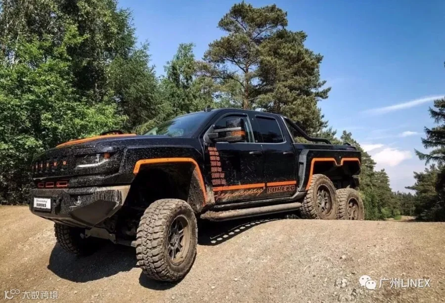 6×6 TUNDRA,隶属丰田坦途系列,由LINE-X MSK和4x4Tundra在俄罗斯生产,全车喷涂LINE-X,不怕剐蹭和锈蚀,可以让爱车放心翻山越岭。
