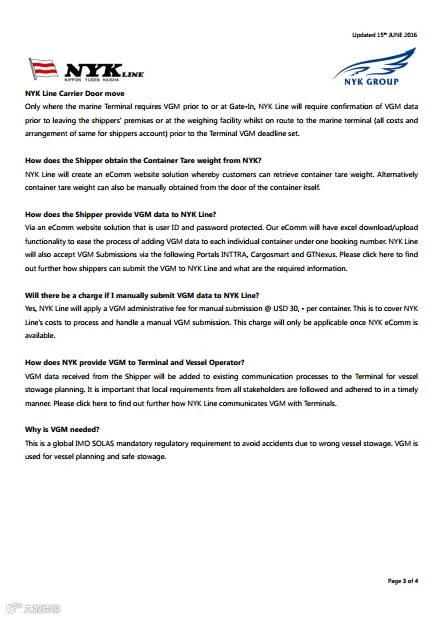 客户使用传真,邮件等纸面方式提供VGM时,由于需要安排专人进行输入,增加人员成本,因此我司将收取VGM输入费用。