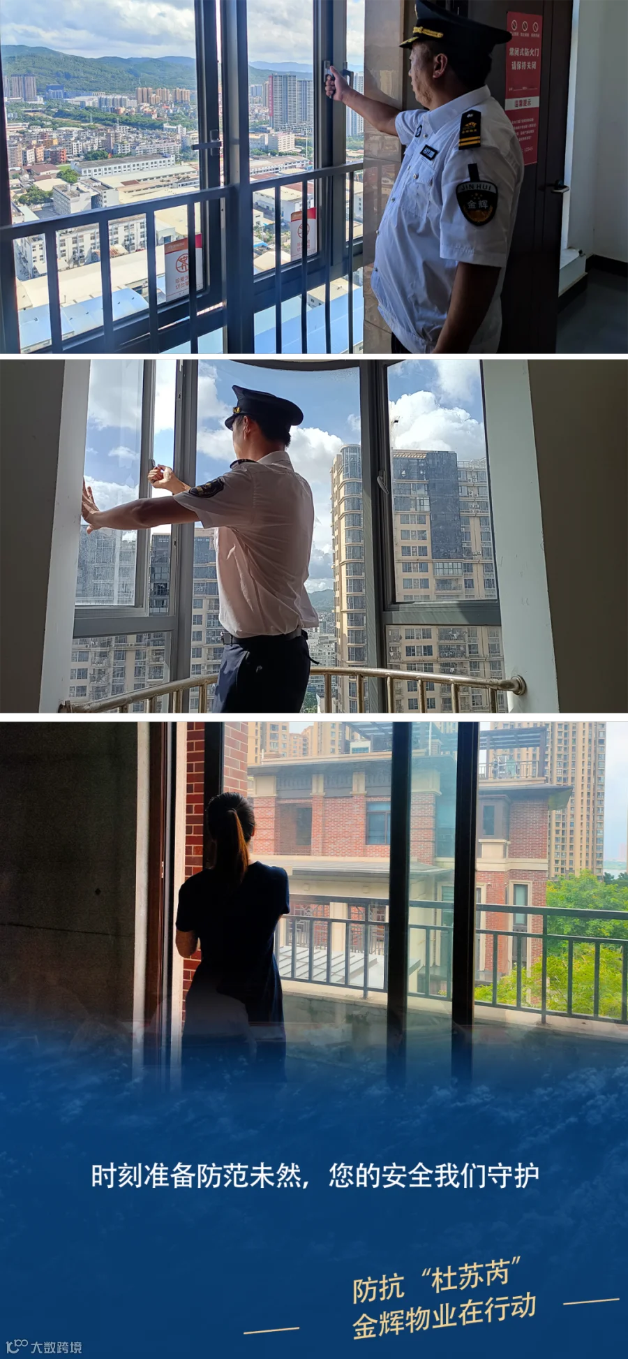 金辉物业工作人员逐户检查空置房,查看门窗是否关紧。阳台及窗台是否有放置杂物。查看天台等公共区域门窗是否关好。逐一关闭门窗,谨防下雨渗水。