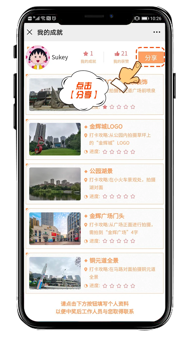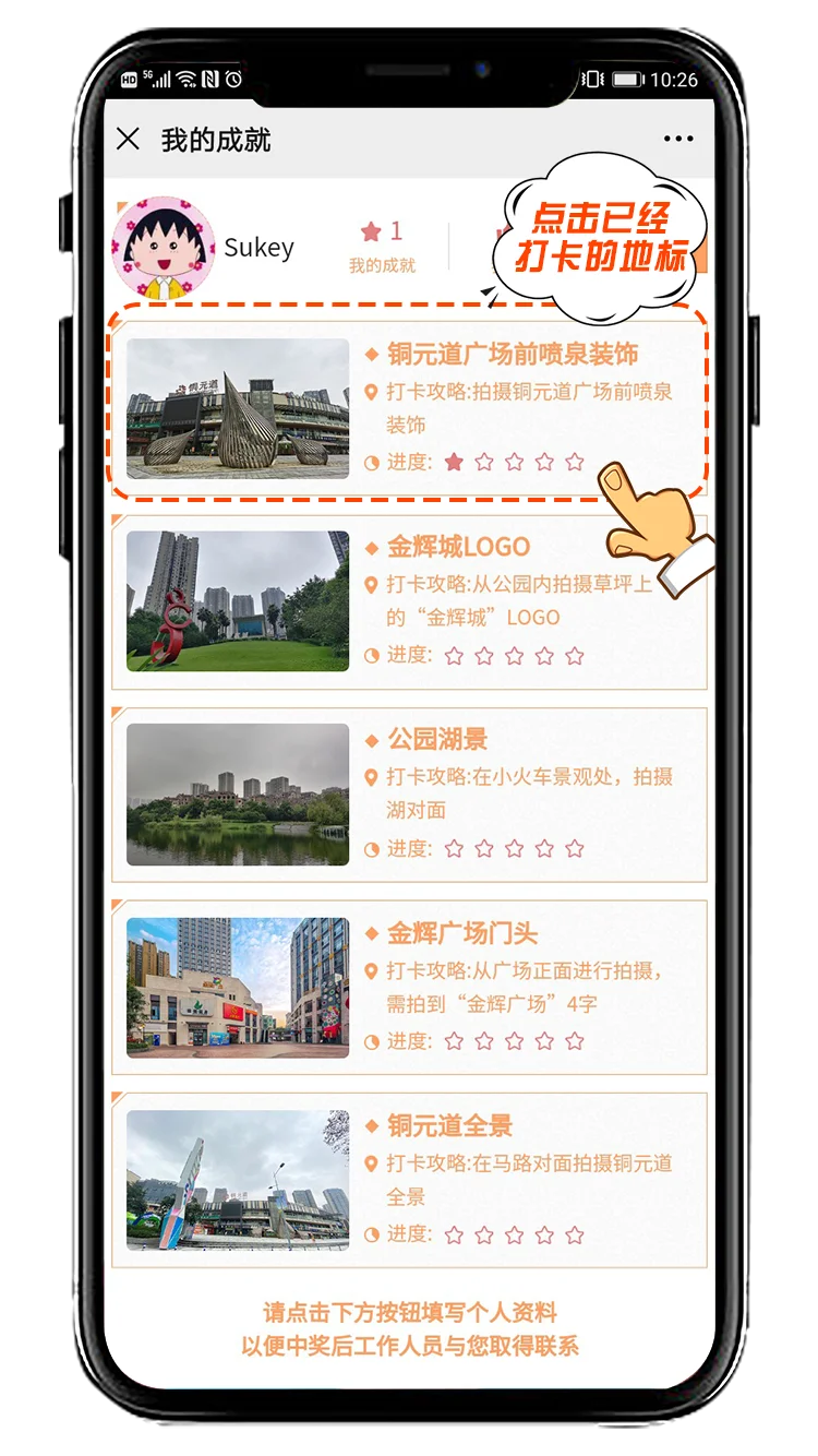 活动要求:选择您要打卡的城市及打卡地标,上传对应时间的照片,从而获得成就值;还可以分享给好友为您上传的照片点赞,获取点赞数。活动结束后凭成就值及获点赞数排名赢取奖品。