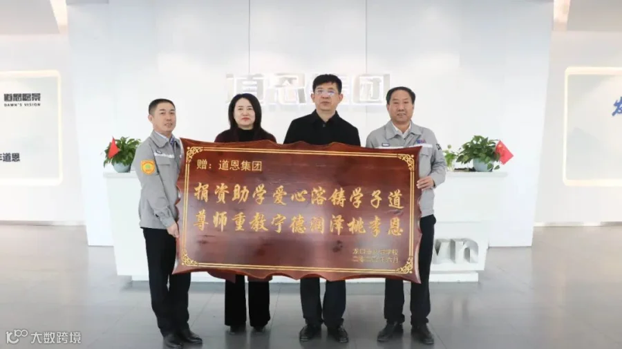 “道恩的大力帮助坚定了我们为教育事业奋斗的决心,增强了学校‘办人民满意的教育’的信心。”12月5日上午,龙口市北皂学校校长解玉慧带着写有“捐资助学爱心熔铸学子道,尊师重教宁德润泽桃李恩”字样的牌匾和一封感谢信,走进道恩集团总部深表敬意与感谢。龙口市教体局副局长赵剑锋,道恩集团董事长、总裁于晓宁,副总裁王可友出席活动。