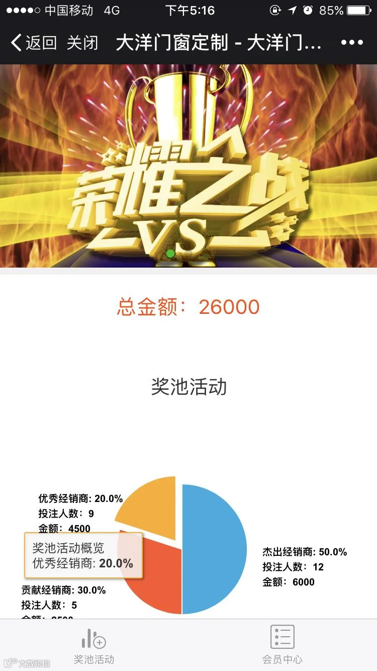 奖池活动主要吸引大洋的经销商参与。用户向奖池投递500元作为报名费用。经销商线下购入大洋产品,前10名可获得双倍消费金额的回馈。该活动推动大洋经销商购买产品,提高公众号活跃度。