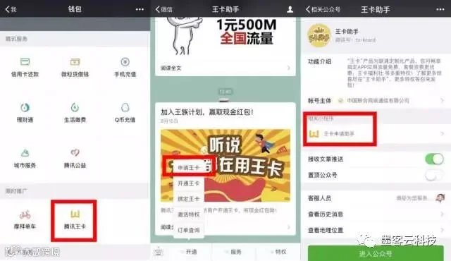 而且,在“王卡助手”公众号中,也能通过相关小程序和公众号主页面进入小程序。
