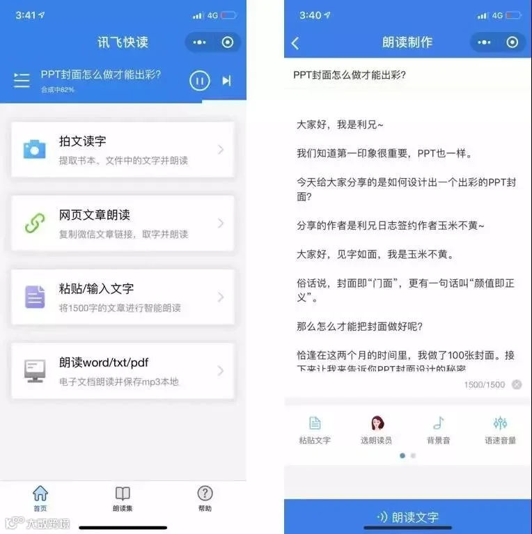【讯飞快读】是一款朗读文字的小程序,可以用相机拍摄文字或者复制网页链接,直接阅读网页内文字。即使是用WORD/TXT/PDF中的文字也可以直接复制阅读。解放了我们的眼睛和双手,可以一边做别的事情,一边听快读语音的内容,提高效率。