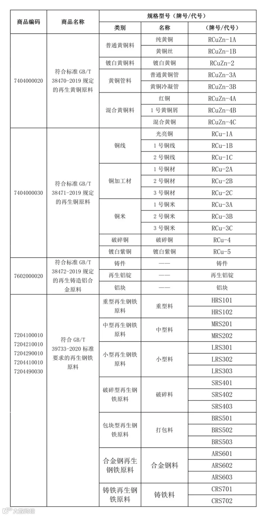 进口再生金属原料商品编码及对应代号/牌号信息表