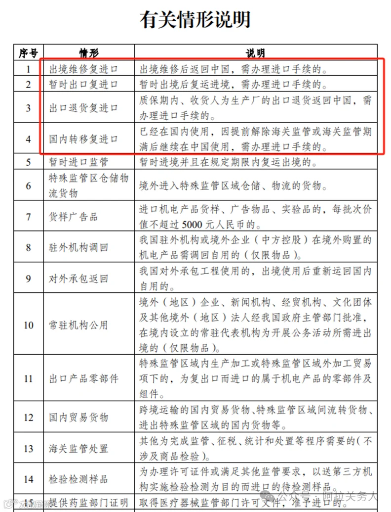 暂时出口复进口是指暂时出境后复运进境,需办理进口手续,与监管方式暂时进出口货物暂时出口复进口情形一致,出口退货复进口是指质保期内、收货人为生产厂的出口退货返回中国,需要办理进口手续,与监管方式原出口货物退运进口的退运货物情形一致。出境维修复进口是指出境维修后返回中国,需办理进口手续,与监管方式修理物品的出境修理复进口情形一致。