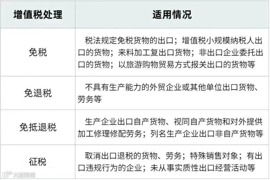 没问题,我这就来给你讲讲。首先我们先跟着下图来看一下出口企业增值税政策的不同处理情况: