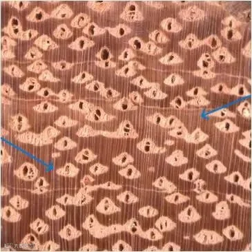 轴向薄壁组织:在木材横切面上,可见一部分材色较周围稍浅、用水湿润后更明显、并能形成各种形态的组织。薄壁组织的清晰度和分布类型是识别阔叶材的重要依据。
