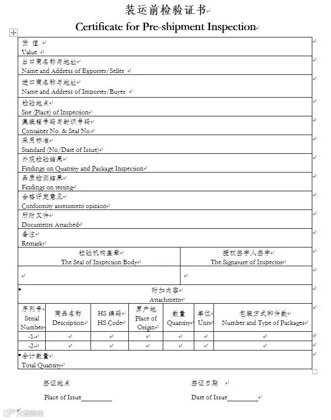 施检部门应在完成检验后的5个工作日内,由经备案的授权检验员签发装运前检验证书。证书应为包含货物信息、检验依据、检验结果、集装箱号码与封识号码等内容的中英文合璧版本。