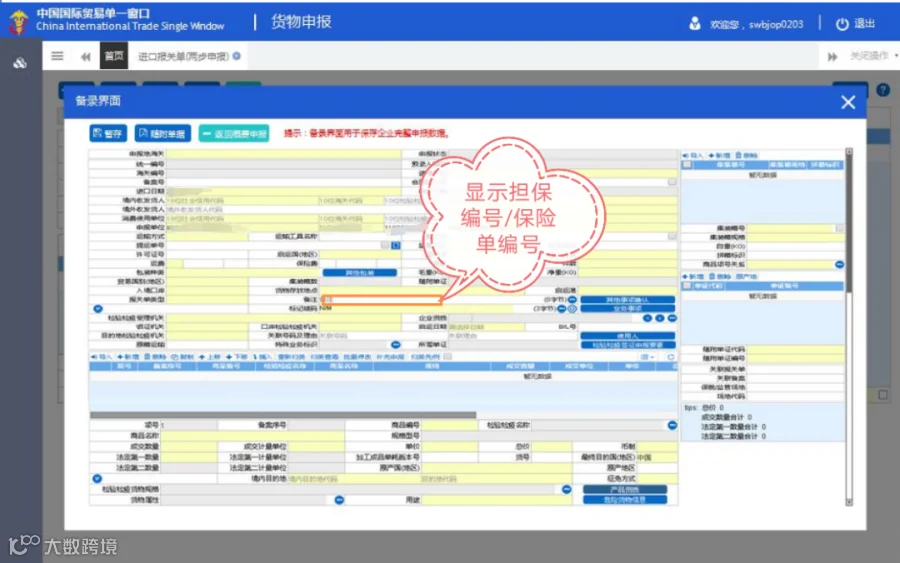 选择的担保编号/保险单编号,会显示在“备注”字段中,供企业查看。