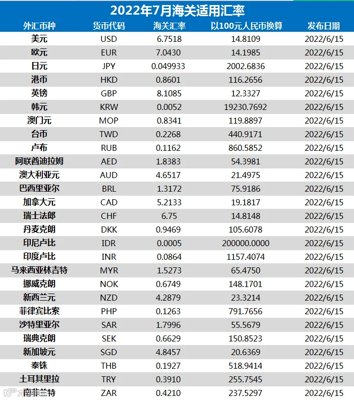 导读:2022年7月海关汇率