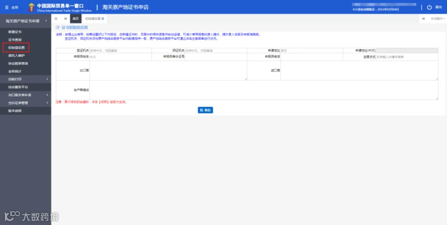 自理企业点击左侧菜单栏“初始值设置”,可设置原产地证初始值,如签证机关、领证机关、申请地址、出口商英文、申报员身份证号码等。在新建证书时,页面中的相关信息将自动返填,减少了常用信息的录入操作,提升了录入效率及申报准确率。