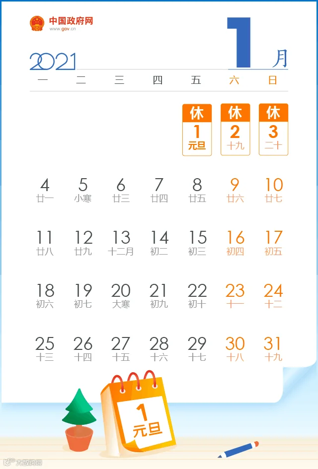 根据国务院办公厅有关通知,青岛海关2021年元旦于2021年1月1日(周五)—2021年1月3日(周日)放假,共3天。