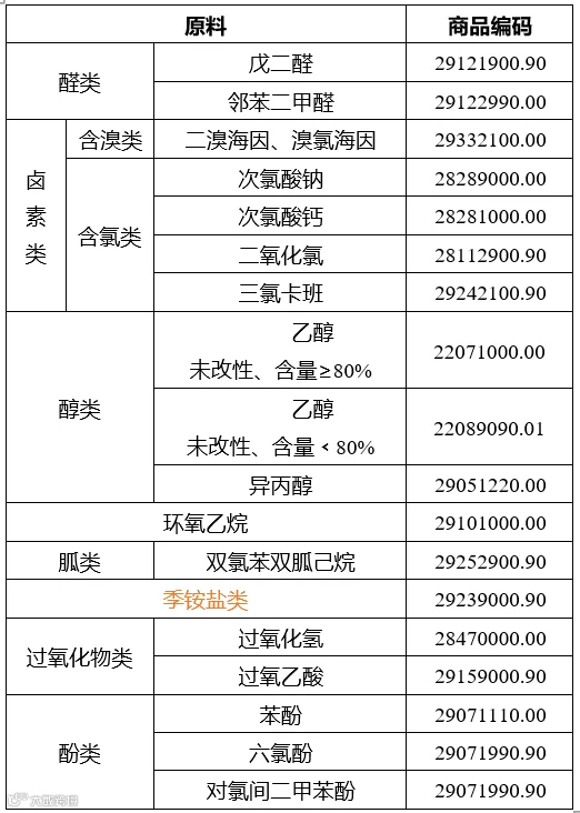 消毒剂原料往往是单一的已有化学定义的化合物。消毒剂原料按照化学成分可分为醛类、环氧乙烷、卤素类、醇类、酚类、胍类、季铵盐类和过氧化物类。以下是各类消毒剂原料对应的商品编码。