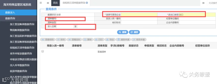 进入数据查询- - -保税核注清单数据查询,以综保区内的一单为例QD******E00000****