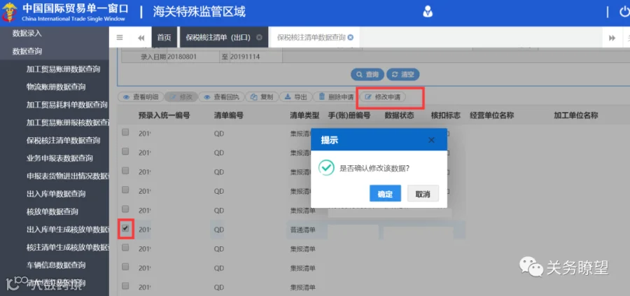 7.核注清单状态为预审批通过、审批通过状态,且核扣标志为“预核扣”、“已核扣”的数据可以申请修改;