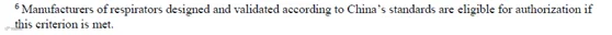 该条加注:如果符合这个原则,按照中国标准设计和验证的口罩的制造商是可以获得EUA授权的。