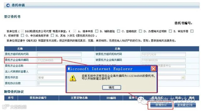 c. 如果双方此前未签署过委托书,或者委托书已经过期失效,系统提示“系统中不存在 企业海关编码为xxxxx的委托书,开始建立委托书”。