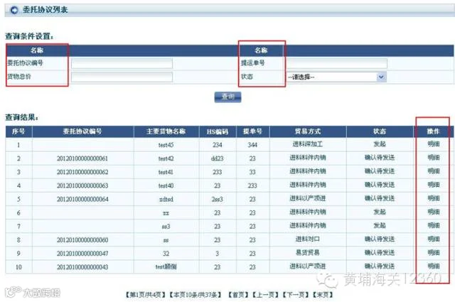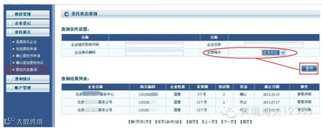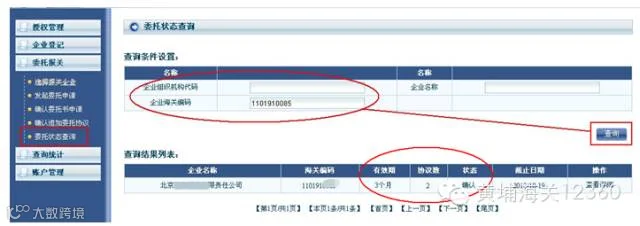 a. 申报单位用户进入“委托报关”中的“委托状态查询”菜单,按照对方企业基本信息的条件设定,可以查找具体与哪些企业签署了委托关系书,及委托关系书的有关信息,点击“查看明细”可进行该份委托书项下具体协议的查看。