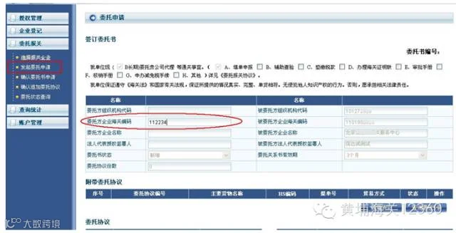 b. 直接进入委托书/委托协议 界面,需要在“委托方企业海关编码”字段中,录入对方(经营单位)的海关10位编码,点回车键。系统将自动判断是否与该经营单位之间,签订过委托书。