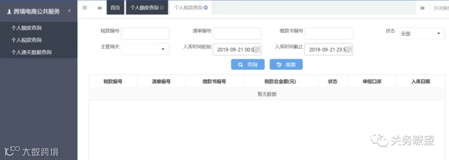 3.登录后可通过点击左边的导航栏中的个人额度查询、个人税款查询、个人通关数据查询功能查询相应数据。