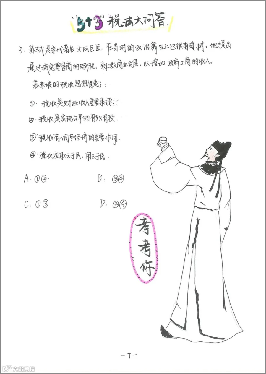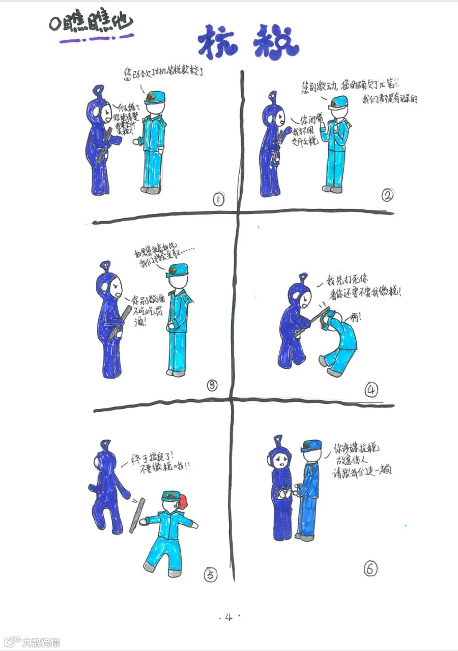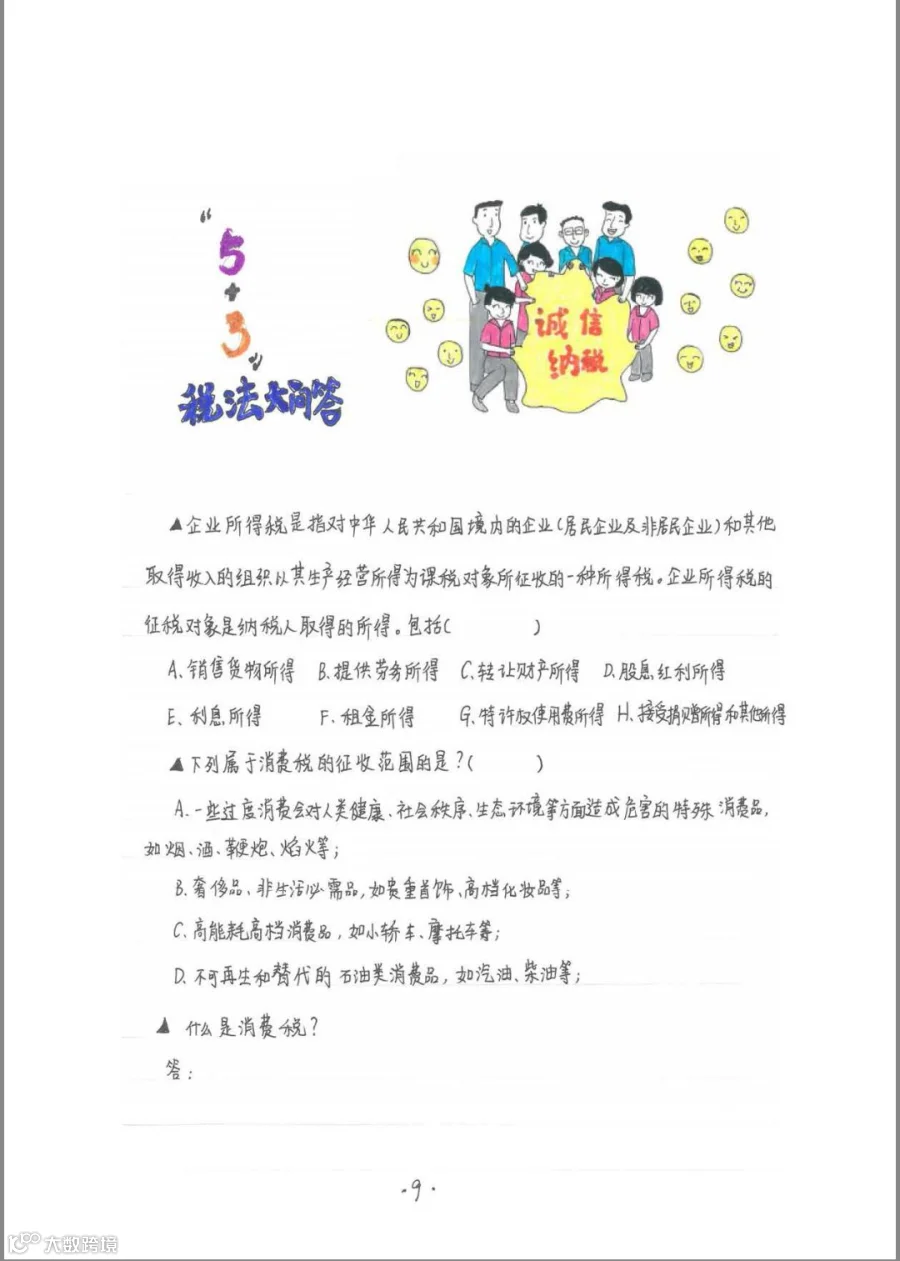这群青春活泼又开始有独立思考的孩子们,用奇妙的想象力把画册分为三个部分: 一是“瞧瞧他”,用反面案例的漫画诠释违反税法终享苦果;二是“考考你”,以学生耳熟能详的“5+3”考题模式解释几大税种;三是“人人说”,用漫画配文传递依法纳税、诚信纳税的理念。画册中的漫画形象、语言文字和思维方式十分贴近00后审美趣味,在轻松幽默中让青少年认识税收、了解税收、培养诚信纳税的意识。