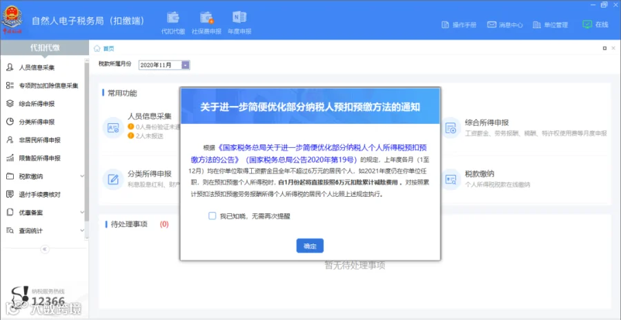 登录扣缴端,首页会自动弹出《国家税务总局关于进一步简便优化部分纳税人个人所得税预扣预缴方法的公告》的政策通知,可点击蓝色字体查看政策解读。