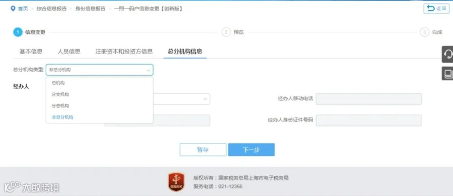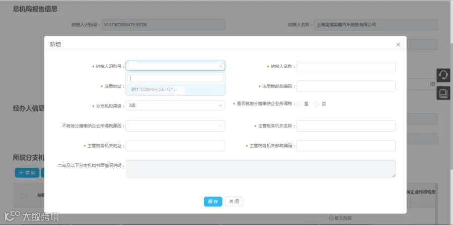 选择已在税务登记模块维护过的分支机构纳税人识别号,系统带出“纳税人名称”、“注册地址”、“注册地邮政编码”信息。