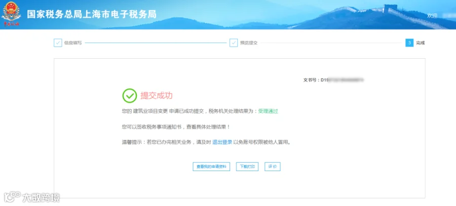 第六步:预览提交;确认信息无误后,点击“提交”;提交至税务端审核;该流程提交至项目所在地主管税务机关审核;