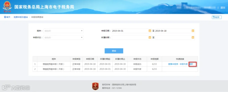 申报成功后,点击“查询”按钮,查询到已申报成功的申报表;对应的功能按钮有:查看申报表、申报作废、缴款;(也可在功能按钮中选择“申报结果查询”按钮进行申报结果查询;)