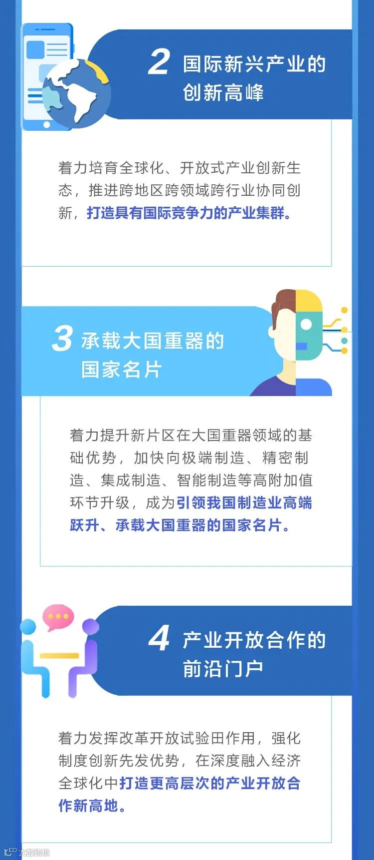 一是在发展定位上,通过“高端引领、一流发展”“创新驱动、开放发展”“智慧生态、融合发展”“区域联动、协同发展”,着力推进五个“打造”,将新片区打造成为全球资源配置的战略枢纽、国际新兴产业的创新高峰、承载大国重器的国家名片、产业开放合作的前沿门户和产城深度融合的品质标杆。