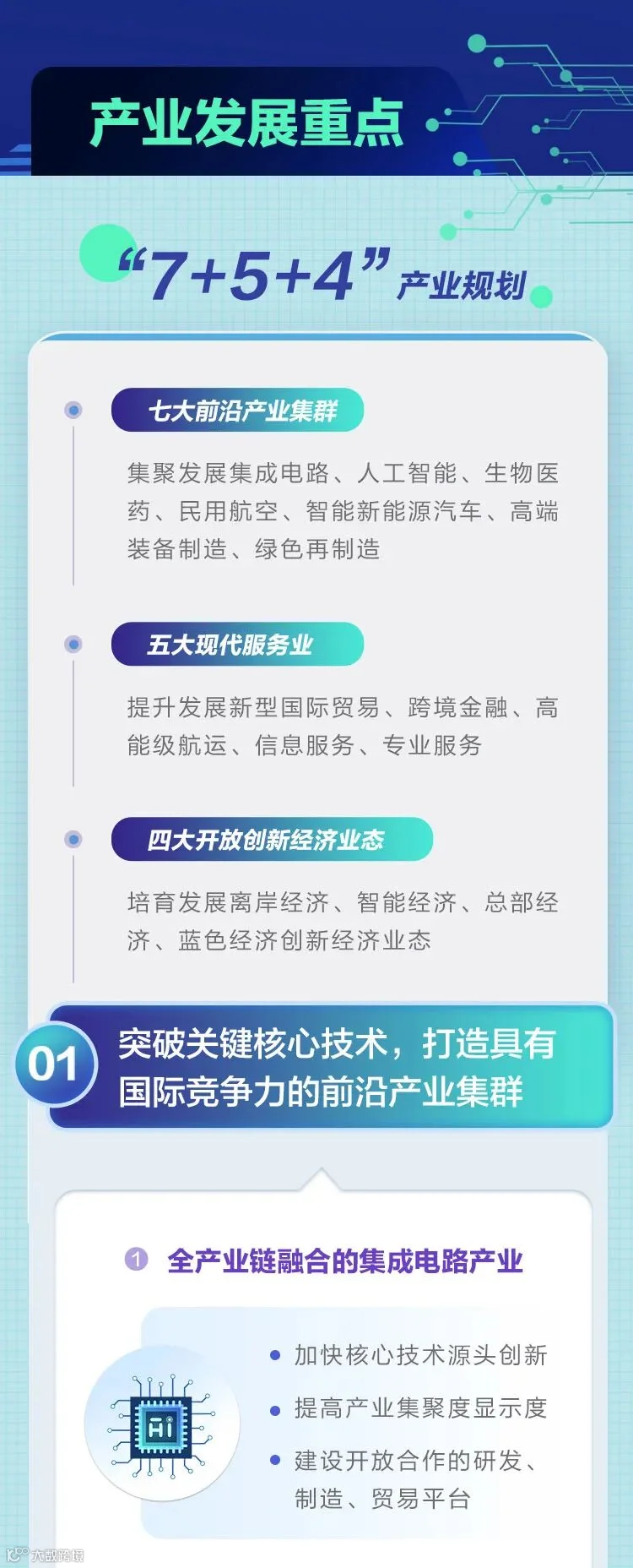 依托新片区制度创新优势,立足增强全球资源配置功能,构建“7+5+4”为重点的世界级、开放型、现代化产业体系。其中,“7”重点聚焦先进制造业前沿产业集群,“5”以新型国际贸易、跨境金融服务等现代服务业为主,“4”是依托“7+5”产业,面向未来在经济业态上的延伸、面向全球在核心功能上的强化、面向大洋在发展形态上的融合。具体包括: