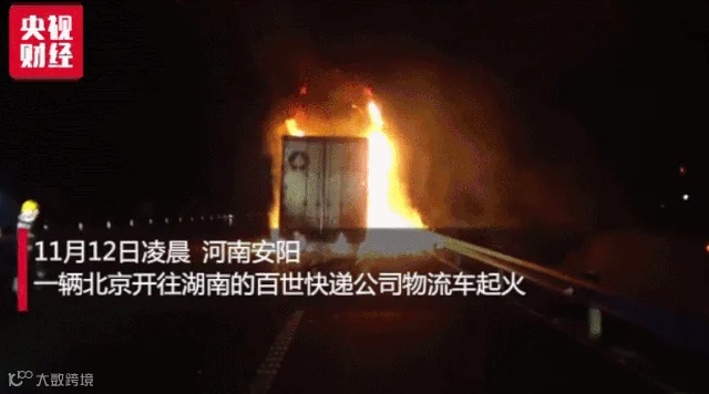 11月12日,一辆满载快递的货车行驶至京港澳高速安阳段时,突然起火。这辆车长约15米,满载快递包裹,车身有大量火光冒出,浓烟滚滚。据消防人员介绍,车厢内包裹重13吨。由于车内快递易燃,车辆燃烧时间过长,大部分货物被引燃,不少快递被现场烧毁,现场无人员伤亡。