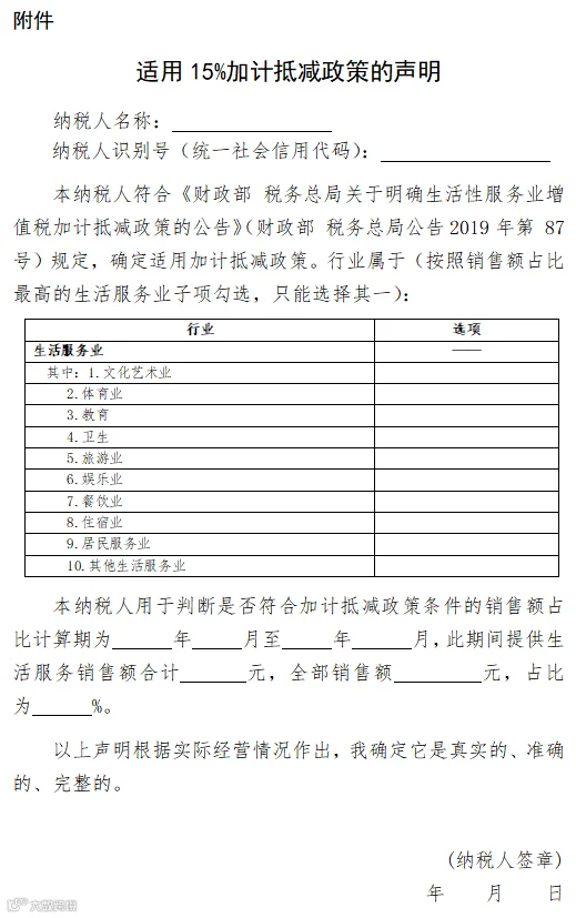 符合《财政部税务总局关于明确生活性服务业增值税加计抵减政策的公告》(财政部税务总局公告2019年第87号)规定的生活性服务业纳税人,应在年度首次确认适用15%加计抵减政策时,通过电子税务局(或前往办税服务厅)提交《适用15%加计抵减政策的声明》(见附件)。