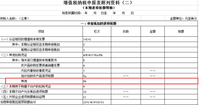 加计扣除部分需要填入《增值税纳税申报表附列资料(二)》(本期进项税额明细)第8a栏“加计扣除农产品进项税额”“税额”栏,如下图。