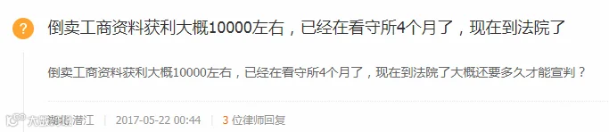 在保护涉密信息工作上,国家相关部门也付出了很大努力。比如在某网站上,有人向律师提问,“倒卖工商资料获利大概10000左右,已经在看守所4个月了,现在到法院了大概还要多久才能宣判?”